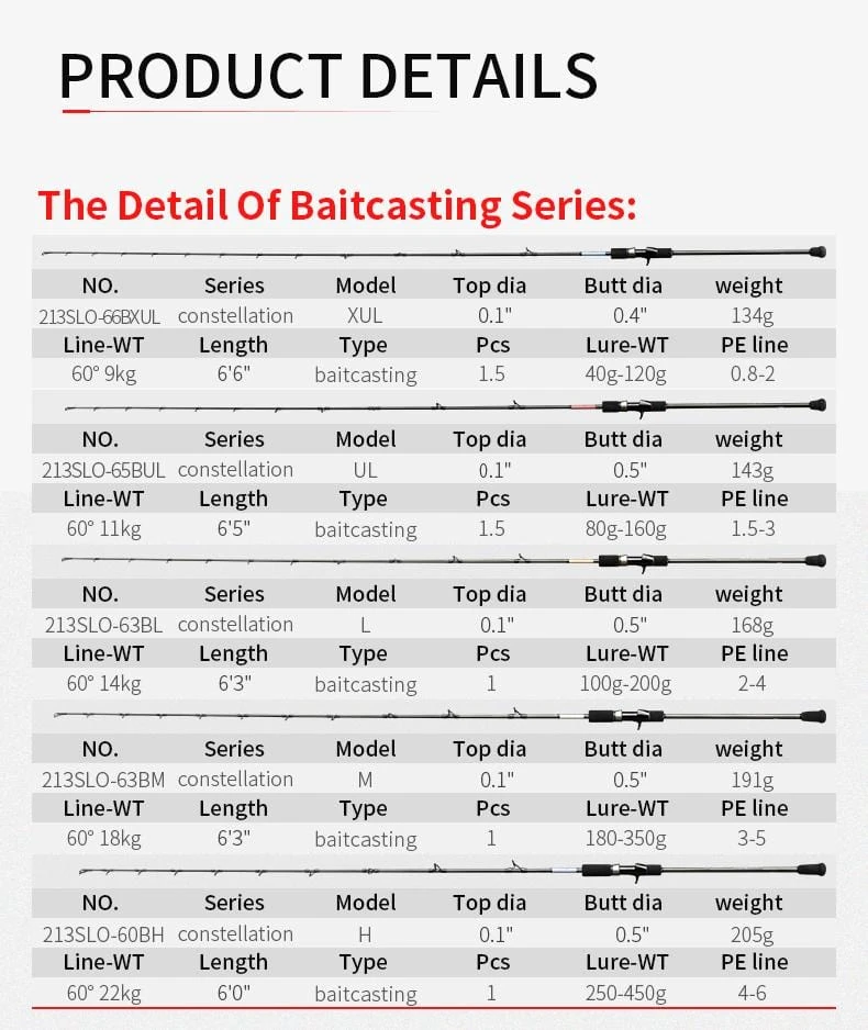 | 66BXUL | 134g | 6’6″ | 2 | 4–120g | 0.8-2 | 9kg |