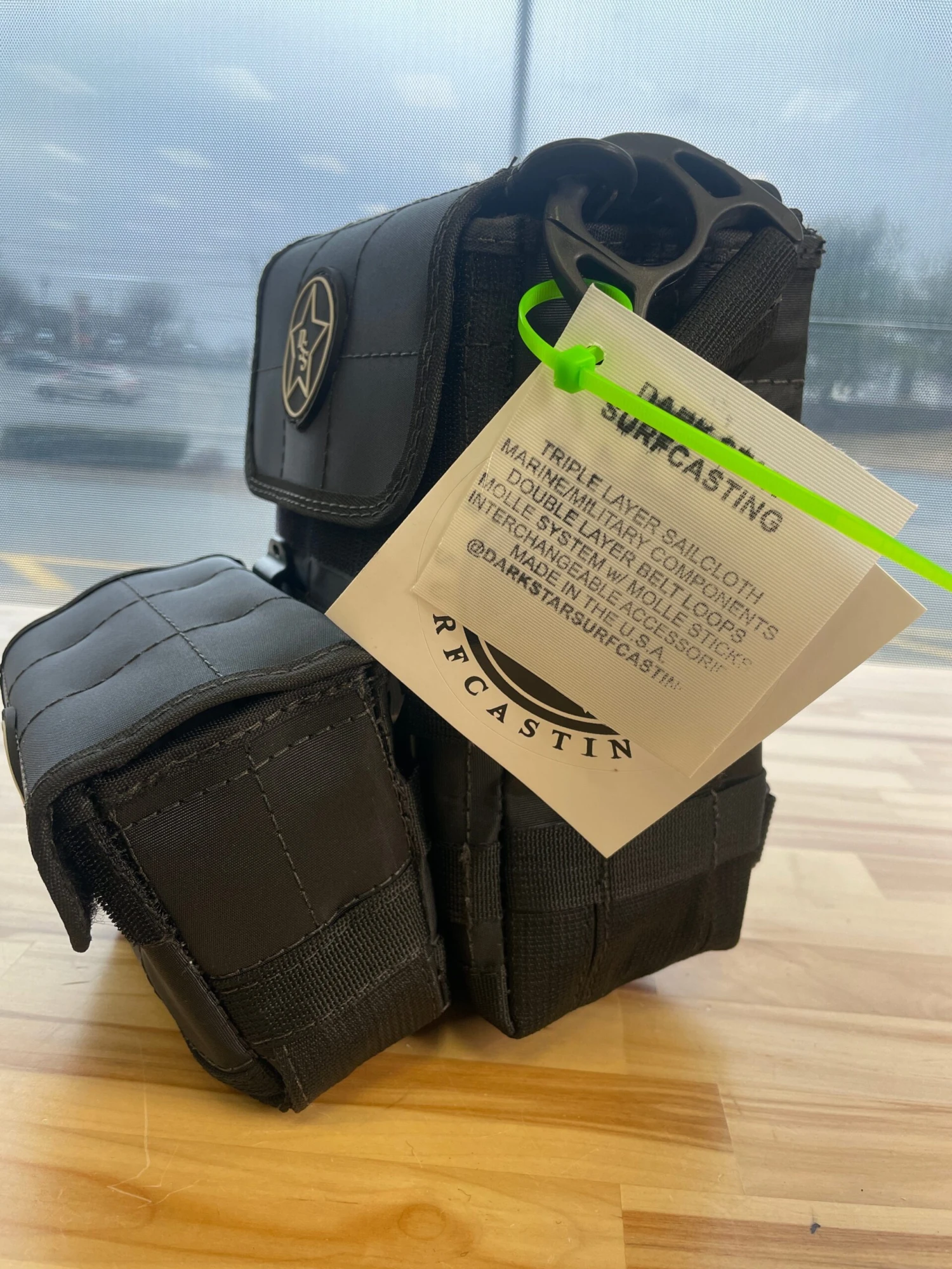 Built with three layers of heavy duty Dacron sailcloth, these two tube surf bags from Dark Star Surfcasting are perfect for those quick missions to the beach when surfcasting in the Northeast for Striped Bass or down in the Southeast when chasing Snook and Tarpon. Featuring two large tubes, this bag is perfect for those who know exactly what they want to be carrying when going to their spot. The main compartment with the two tubes also features 4 bucktail slots and a large pouch for carrying spare leaders and other accessories you may need on your trip! The removeable front pouch is perfect for your soft plastics, bucktails, and smaller rigged eels. Large 1/2″ drain holes on both the front pouch and on the main bag ensure that you are not weighed down by water when climbing through boulderfields or taking waves when on Jetties.