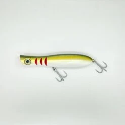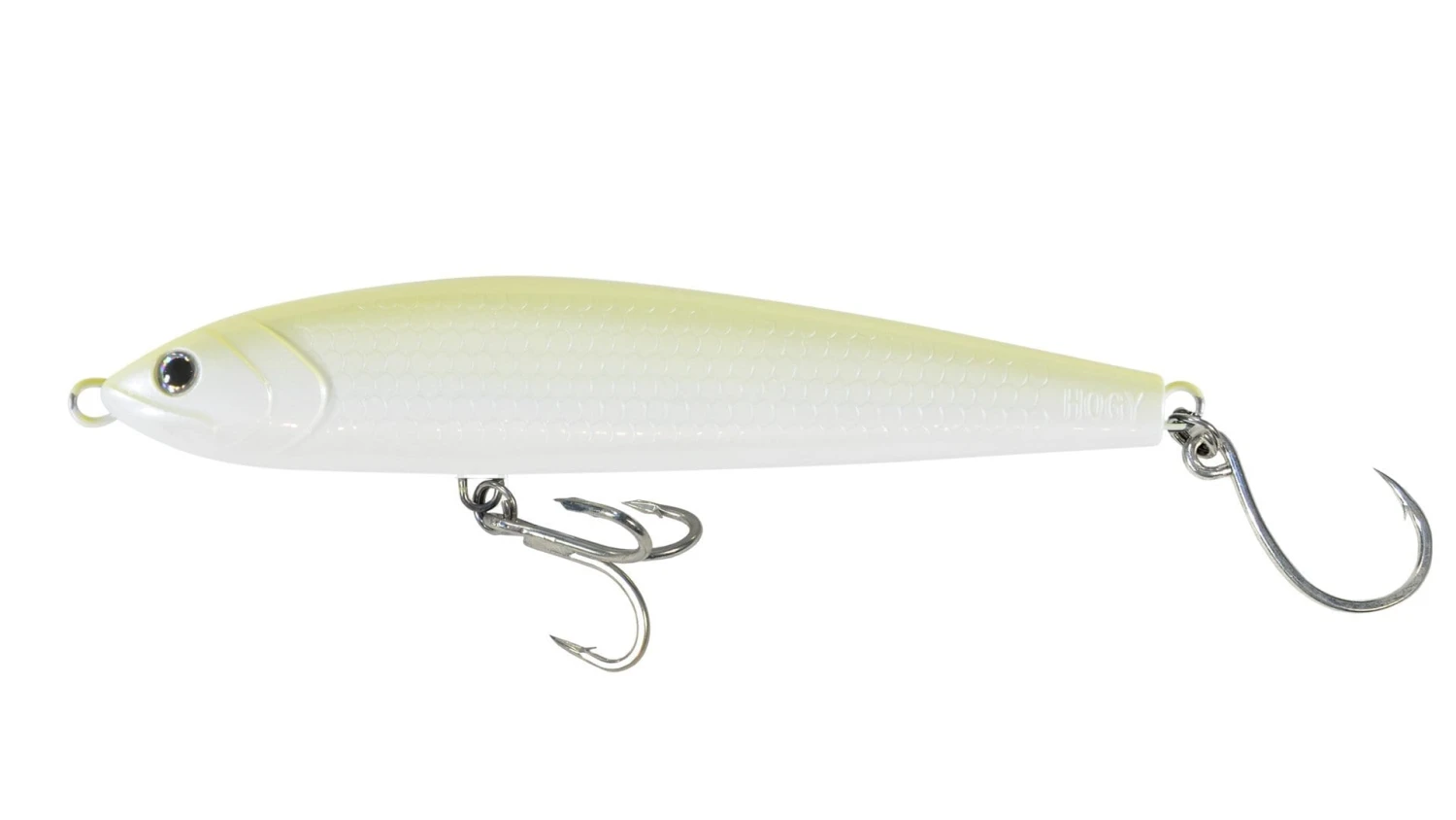 Hogy’s Charter Grade Dog Slider is the little brother of the Hogy Charter Grade Slider. This is smaller version is more suited towards inshore and lighter offshore use, whether it be for stripers, tuna, bluefish or any other predatory gamefish. The size profile of this lure mimics ticker mackerel, herring, mullet, and many other mid size baitfish well. Out of the package, each Dog Slider is equipped with a 1/0 VMC 9626 Treble and a 3/0 VMC 7266 inline hook. This lure was designed under typical conditions to fish 2-3 feet below the surface with a slow side-to-side wobble with little effort by the angler to utilize.
