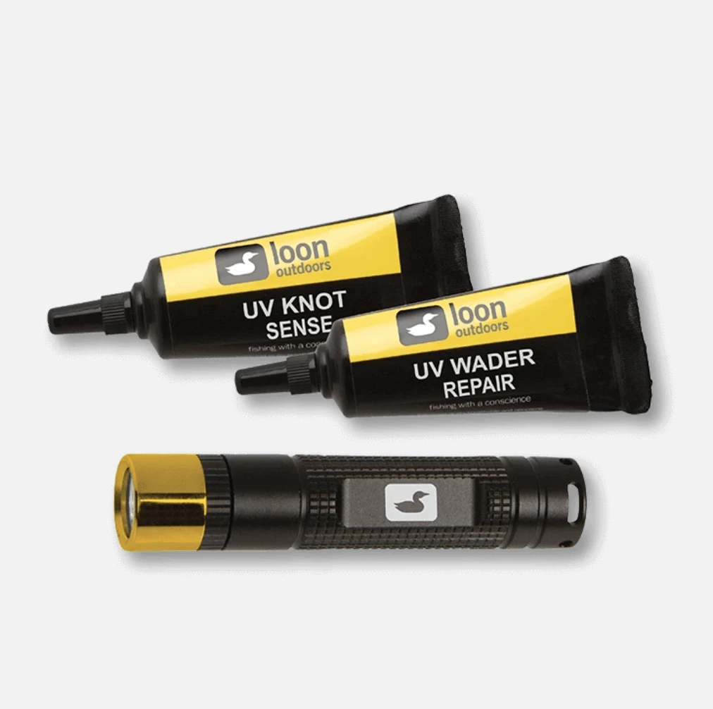 A package deal for all your knot coating and wader repair needs. This kit includes both knot sense resin and wader repair resin, as well as a micro UV cure light with lanyard.