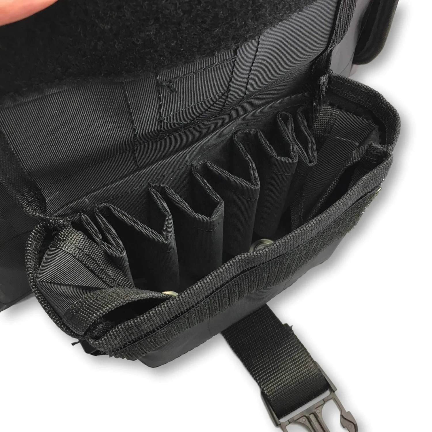 - 6 (8 on the 3.5) heavy duty wide bucktail slots compartment divider with a belt loop