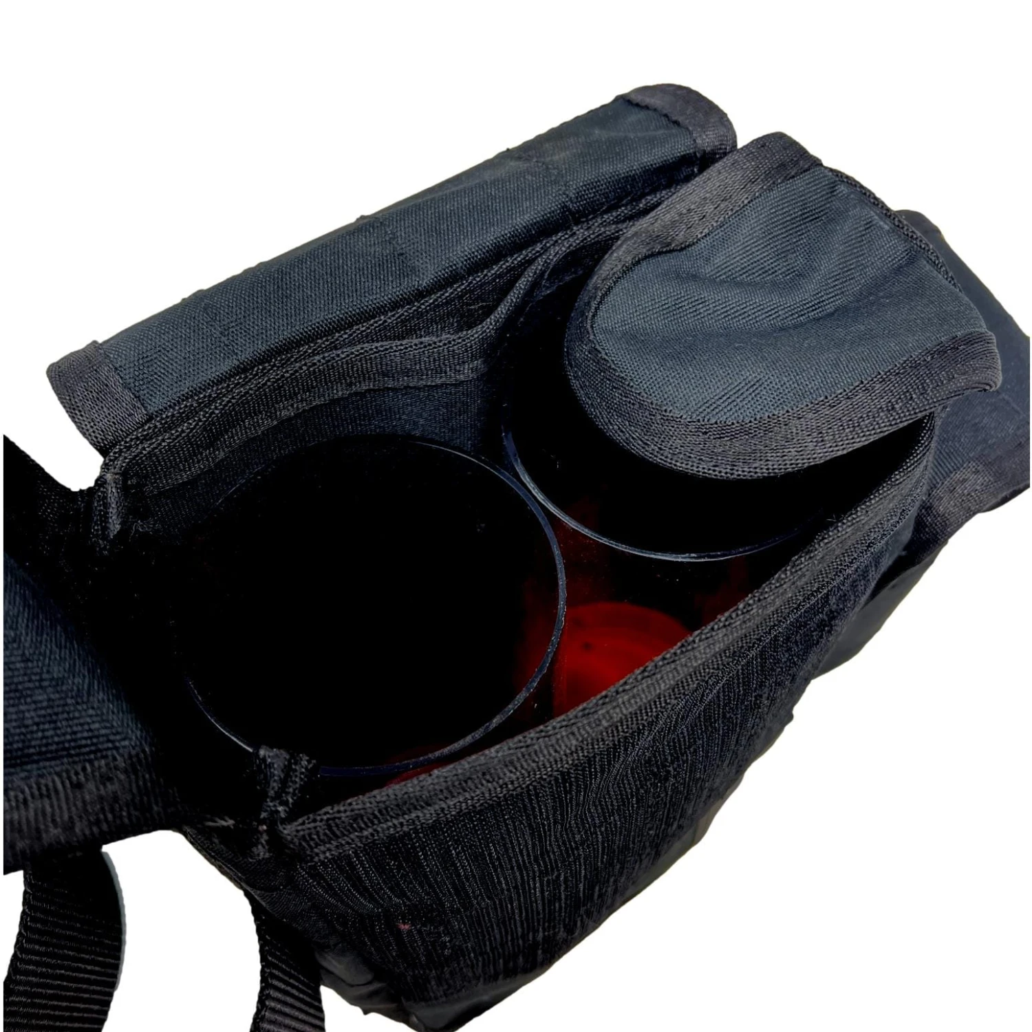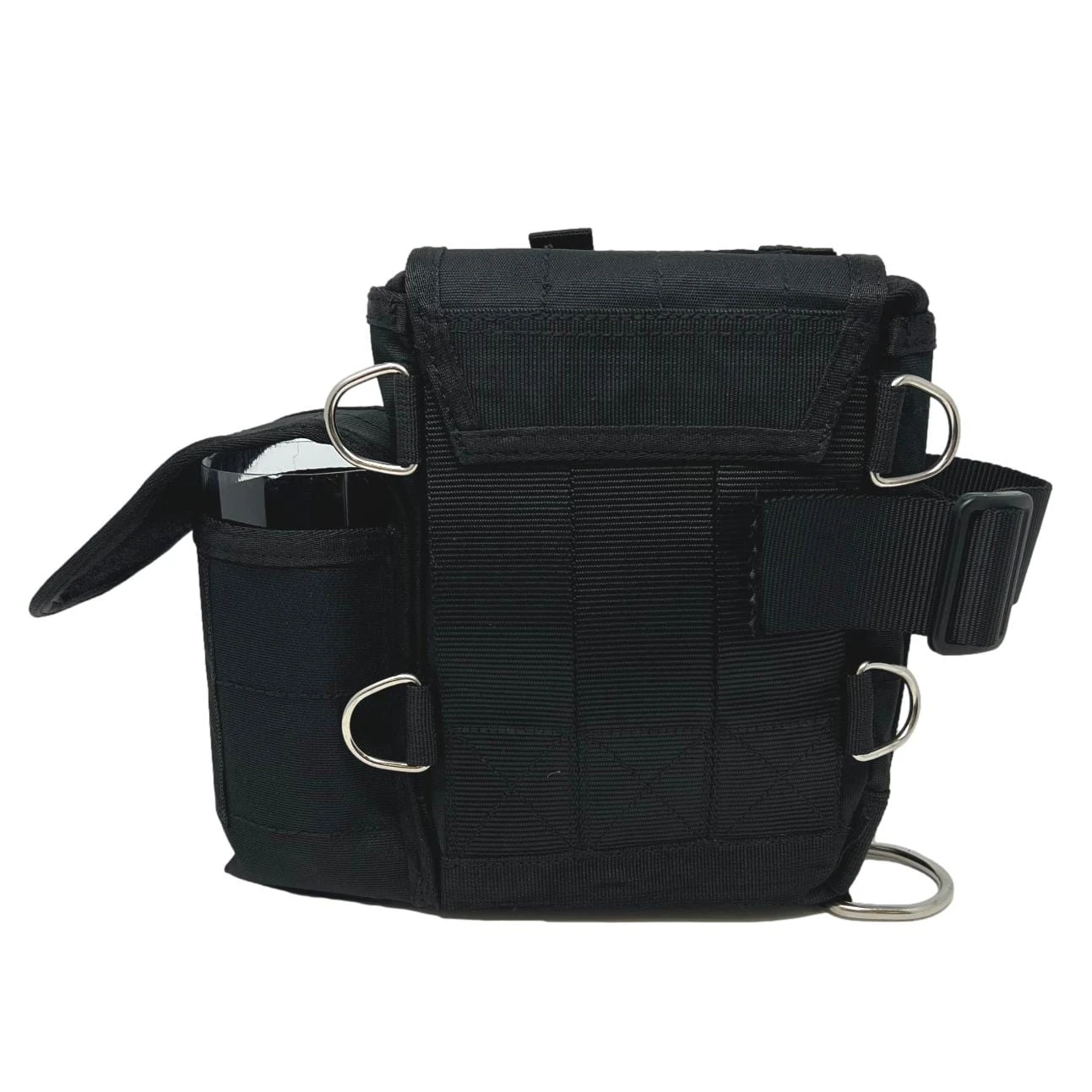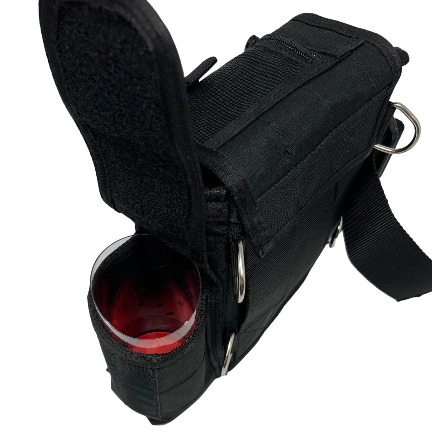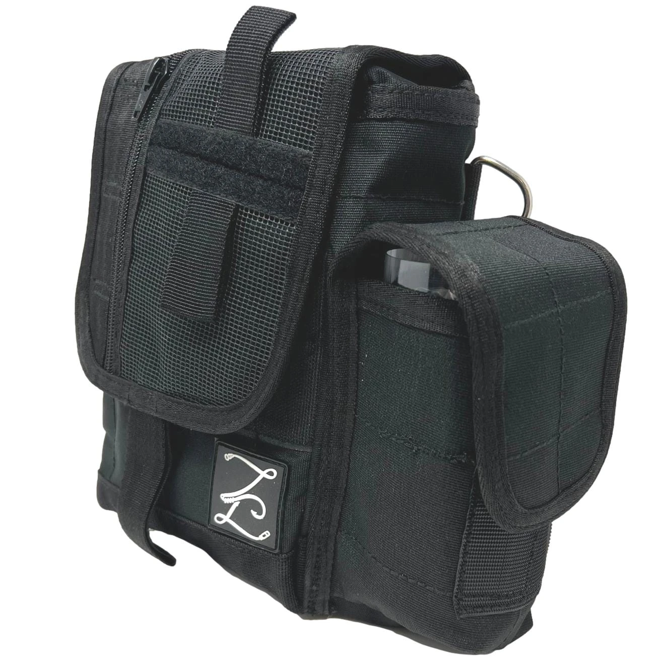 On the right side of the bag, a additional storage pouch allows for a shorter third tube and convert this bag into a three tube bag. It also fits other accessories and tools like a water bottle, buck tail trailers and more. On the left side of the bag, a short 2″ wide utility strap accommodates a variety of tools and gear. Small belt accessories like knives, pork rind holsters, plier sheaths and others fit well on the utility strap, while boga grips and other gripping tools fit when attached to the large D-ring and secured snuggly on the utility strap.